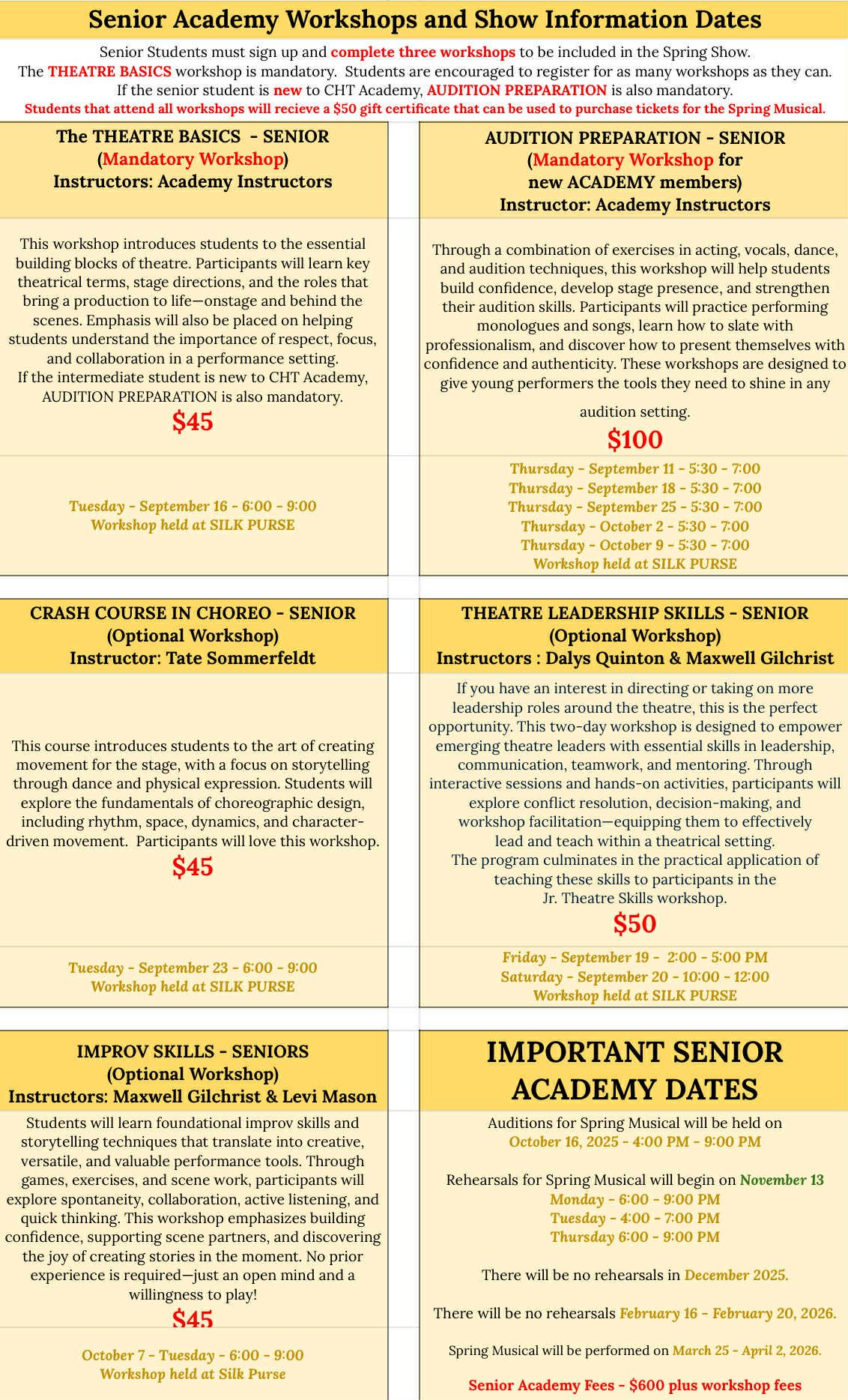 We are excited to bring something fresh and exciting to this years CHT Academy. Instead of weekly fall classes, we’ll be offering a series of workshops. Some will be mandatory, while others are optional, but all are designed to give students a dynamic and engaging experience.