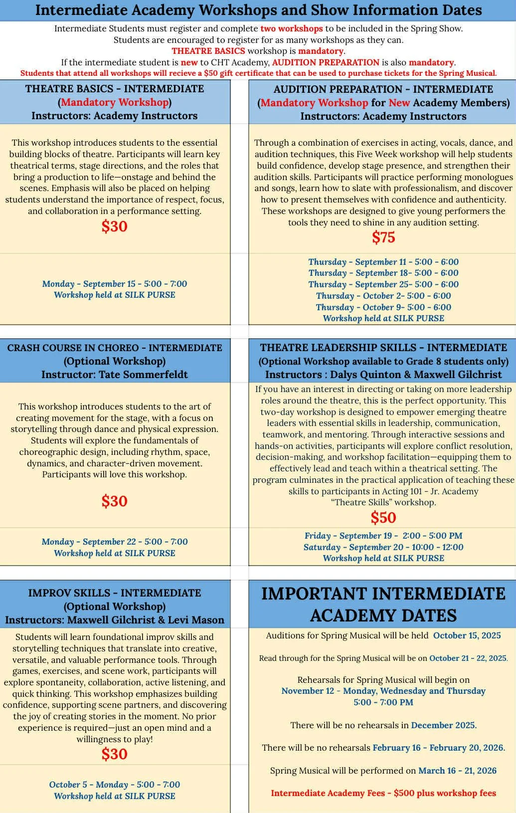 We have attached three extra documents with specific information for each age group, along with a link for online auditions. If you have any questions, don’t hesitate to reach out to the Academy instructors - Levi, Juliann and Megan — they’re ready and happy to help!